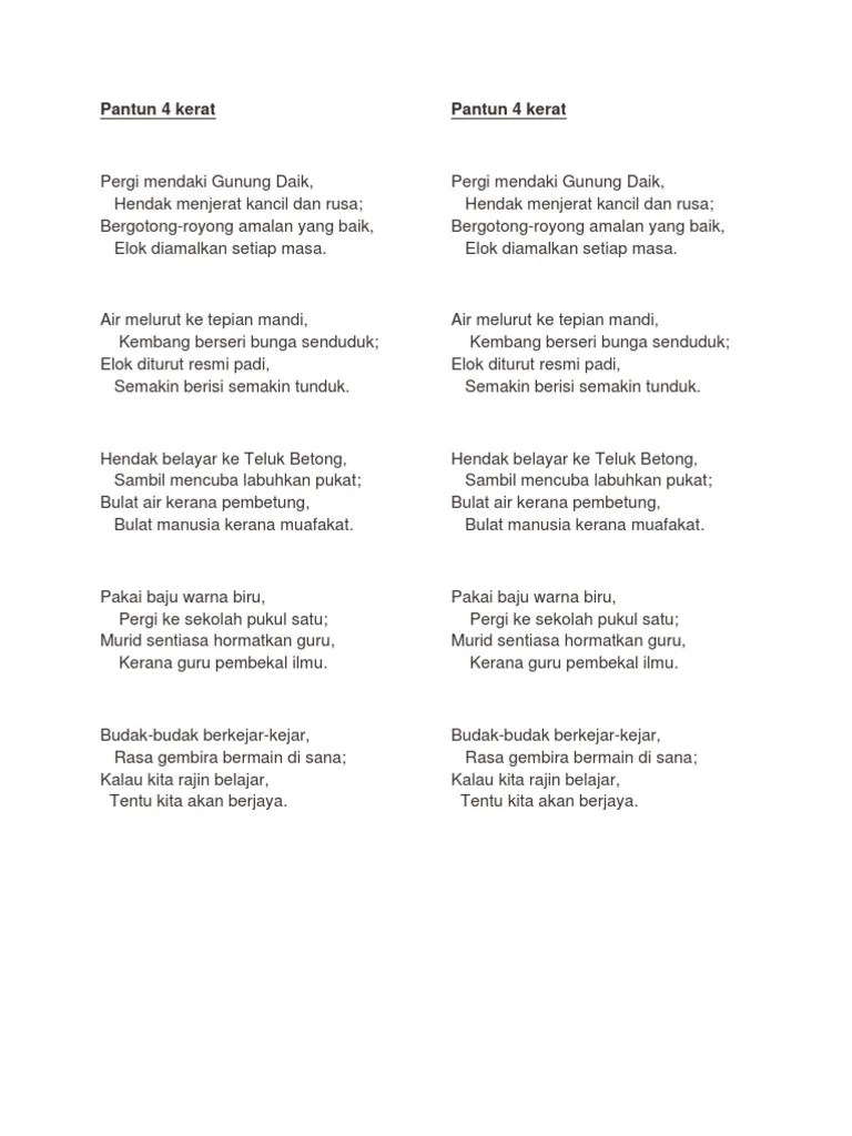 Pantun sendiri berasal dari kata minangkabau "patuntun" yang berarti "pemandu". Sanusi ibnu din assingkiri on . Isi pesan umumnya berisi perbuatan baik dan melaksanakan ibadah. 2812021 bab 8 puisi rajin membaca terbaru rpp bahasa indonesia kelas 4 semester 2 tentang pantun ilmusosialid contoh pantun nasihat 4 kerat sekolah rendah . Pantun nasihat 4 kerat sekolah rendah. Pergi ke sekolah pukul satu,. Kuiz teka silang kata tahun baru cina via. Himpunan pantun nasihat orang melayu dulu dulu yang penuh hikmah. Hanyut rumpai di bawah titi. Itu saja beberapa kumpulan contoh pantun nasehat anak anak sekolah. Biasanya mereka sudah mengenal pantun semenjak kelas 4. 37 contoh pantun jenaka 4 baris, lucu dan menghibur. Contoh pantun 4 kerat sekolah rendah. Pergi ke sekolah pukul satu;.
